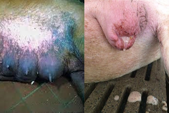 1–3 ngày sau sinh: nái sốt nhẹ hoặc cao, bỏ ăn, heo con bấu vú kêu nhiều, bầu vú nóng, đỏ, cứng.